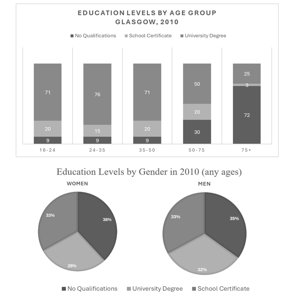 The charts below give information about levels of education in Glasgow, a city in Scotland, in 2010.