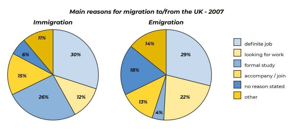 The pie chart below details the rationales for immigration to and emigration from the UK in 2007.