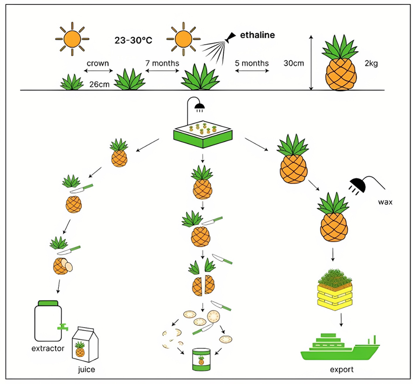 The diagram below shows the process of growing and preparing pineapples and pineapple products.