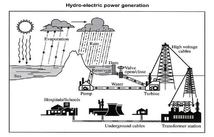 The diagram below shows how electricity is generated in a hydroelectric power station. Summarise the information by selecting and reporting the main features, and make comparisons where relevant.