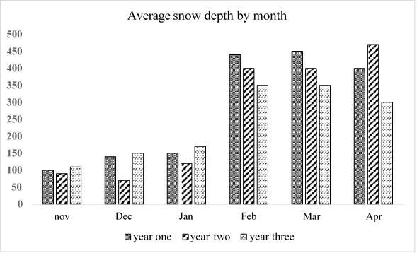The chart below shows depth of snow (cm) in particular ski resort in Canada in three individual years